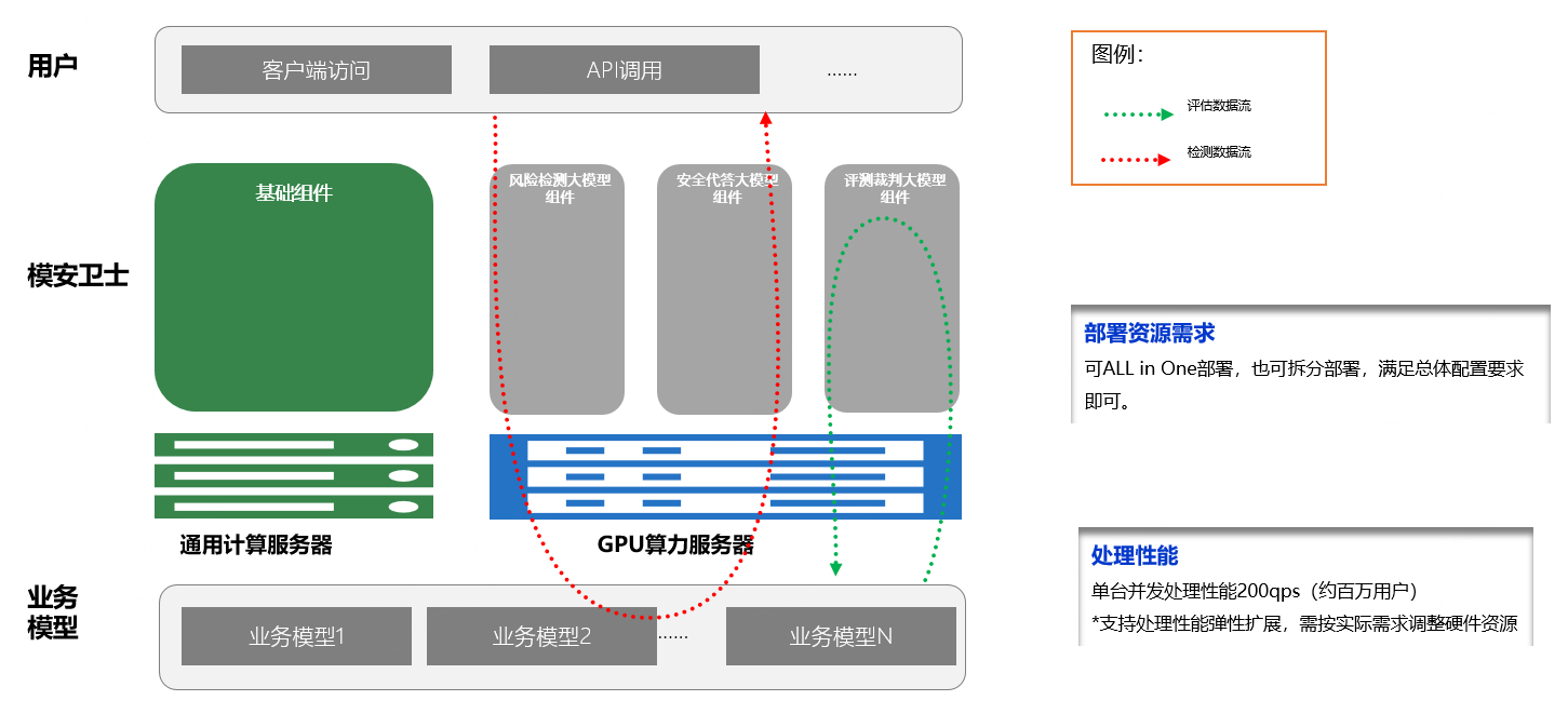 在模型上线前进行全方位安全评测,提前发现风险隐患;采用“以模护模”技术路线,构建风险检测、安全代答等专业模型,形成对大模型的立体防护体系;通过策略调优,词库策略优化持续贴合业务,实现“输入输出内容安全,大模型价值观对其”